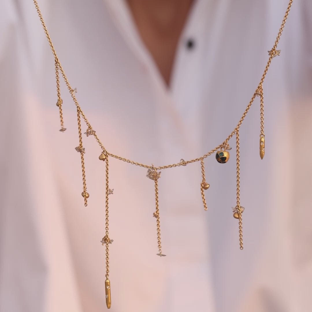 This golden whimsical mess of a composition is elusive with slender yet strong 22K gold handmade chains suspending purposefully to form an uneven fringe. Bunches of rose cut diamonds dangle like glistening berries from their vines and amongst them a dancing bloom charm with its sprouting flowers. A playful symphony, easy-breezy yet abundant, light to wear and impossible to miss.